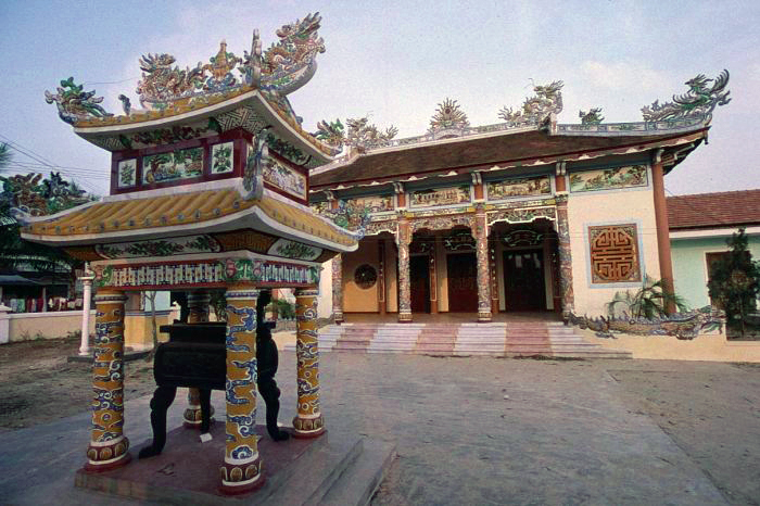 De tweede tempel is de Phung Son Tu Pagode, die een halve kilometer richting rivier ligt. Het lijkt wel alsof deze tempel nog in aanbouw is, maar in mijn boekje staat dat het gebouw al sinds 1940 bestaat. Toch is de buitenkant nog helemaal kaal en is men voor de tempel bezig bestrating aan te leggen. Het zal wel om een grote renovatie gaan. Binnen is de tempel prachtig en is ook te zien dat het gebouw er al wat langer staat. Aan de rijk bewerkte houten zoldering hangen enorme wierookspiralen die zeer langzaam opbranden en een indringende zoete geur verspreiden. Alles is goud, rood en donkerbruin hier binnen. Net een schilderij uit de Gouden Eeuw. De felle zonnestralen schijnen schuin naar binnen en zijn duidelijk zichtbaar in de dichte wierookwalm. Ook hier wordt druk gebeden door voornamelijk wat oudere vrouwen, vaak in het gezelschap van kleine kinderen. Discreet stel ik mijn statief op om wat foto’s van dit schitterende tafereel te maken. Het heiligste is een beeld van Ong Bon, de beschermgeest van geluk en vruchtbaarheid. Ook zie ik een beeld van de veelarmige boeddhistische god voor genade. De tempel heeft een sterk Chinees karakter maar ziet er toch heel anders uit als de boeddhistische tempels die ik in China zelf gezien heb. Buiten staan wat stalletjes waar mensen hun wierookstokjes kunnen kopen. Ik betaal de 1000 dong (€0,08) parkeergeld en pak mijn fiets voor de volgende attractie.