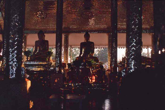 De meeste Boeddhabeelden zijn goudkleurig, maar ik kan niet beoordelen of ze met echt bladgoud zijn bekleed. Jammer dat het zo donker is. Een flinke zaklantaarn was wel handig geweest.