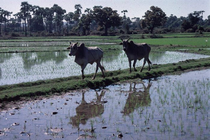 De beelden zijn schitterend met het droge land, de heiige mist, het stof en de laagstaande zon. Een paar boeren laten hun buffels afkoelen in een van de vele riviertjes in het gebied. Ik fiets verder over de dijkjes tussen de velden en geniet met volle teugen van het tafereel dat in geen duizend jaar veranderd moet zijn.
