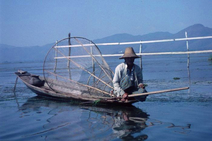 Het is bijna nergens dieper dan een meter of twee en het water is glashelder. Op de bodem groeit dikke vegetatie, waar boten makkelijk in vast kunnen lopen. Daarom hebben de vissers een heel bijzondere manier van roeien ontwikkeld. Ze staan met één been op de achterplecht van hun bootje en gebruiken hun andere been om de roeispaan voort te bewegen. Het zijn ware evenwichtkunstenaars. De stuurman van ons bootje beschikt over een motor en hoeft dus niet rechtop te staan. Om toch goed uitzicht op de vaarweg te hebben, zit hij op een verhoging.