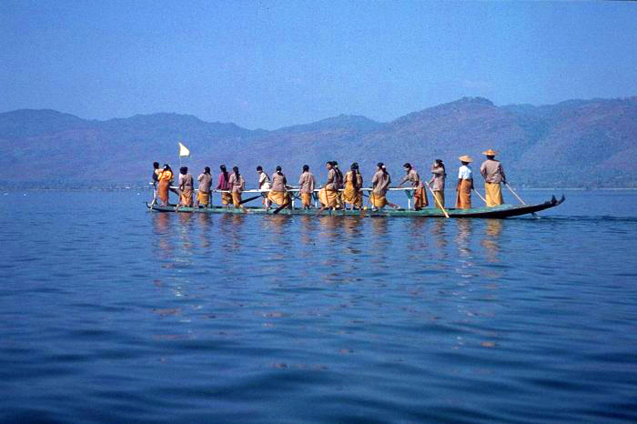 Op lange bootjes staan ongeveer tien meisjes in prachtige traditionele kleding, die net als de vissers met één been op de boot staan en met het andere been een roeispaan aandrijven. Onze schipper laat gelukkig de lawaaiige motor even uit, zodat we het bijzondere schouwspel in alle rust kunnen bekijken. Als de meisjes merken dat we hen bekijken, zetten ze er meteen de vaart in. Even indruk maken op die malle toeristen! En dat lukt. Ik zou ze nooit na kunnen doen zonder in het water te duikelen. Zelfs zonder roeispaan is het al een hele kunst om rechtop op zo’n wiebelbootje te staan. Probeer het dan maar eens met één been en dan nog roeien met het andere ook!