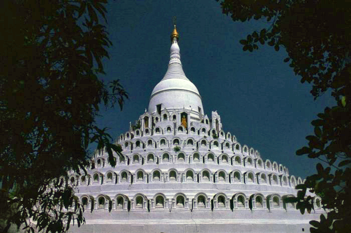 In Mingun had de grootste pagode ter wereld gebouwd moeten worden, maar het werk is nooit af gekomen. Het was een plan van koning Bodawpaya om rond 1800 een 150 meter hoge pagode te bouwen. Toen hij in 1819 overleed, werd de bouw echter stopgezet. Nu staat er een vijftig meter hoog vierkant blok, dat tijdens een aardbeving in 1838 door midden is gescheurd. Daarom zal de pagode nooit meer afgebouwd kunnen worden. Ondanks de hitte toon ik mij toch maar weer van mijn sportieve kant door de pagode te beklimmen. Dat moet op blote voeten, want ondanks de verregaande staat van verval, is het bouwwerk nog altijd een heiligdom. Ik bekijk ook nog het beroemde bejaardentehuis (daarvan zijn er maar twee in Birma). Het is een mooi gebouw en het is best wel bijzonder om bejaarden te zien in Myanmar. Op straat kom je die niet of nauwelijks tegen.
