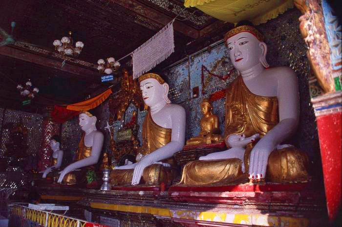 Als laatste bezoek ik de in het zuiden van de stad gelegen Kyaik Pun-pagode. Deze bestaat uit een groot blok waartegen vier enorme zittende Boeddha’s leunen. De beelden zijn zo’n dertig meter hoog. Drie verkeren er in een perfecte staat. Van de vierde is alleen een bakstenen karkas over. De legende luidt dat de beelden aan vier zusters werden gekoppeld. Zolang de zusters niet zouden trouwen, zou het de beelden goed gaan. Eén van de zusters trouwde toch.